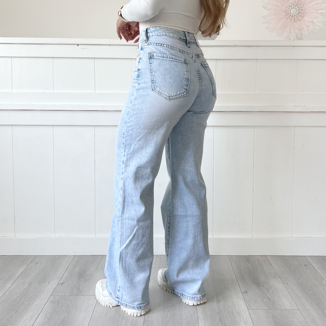Blauwe wide leg jeans, mooie pasvorm en kleur! Op het label staat 'mid rise, full lenght & stretch', persoonlijk vinden wij dat high waist is en er zit wel stretch in maar echt minimaal.