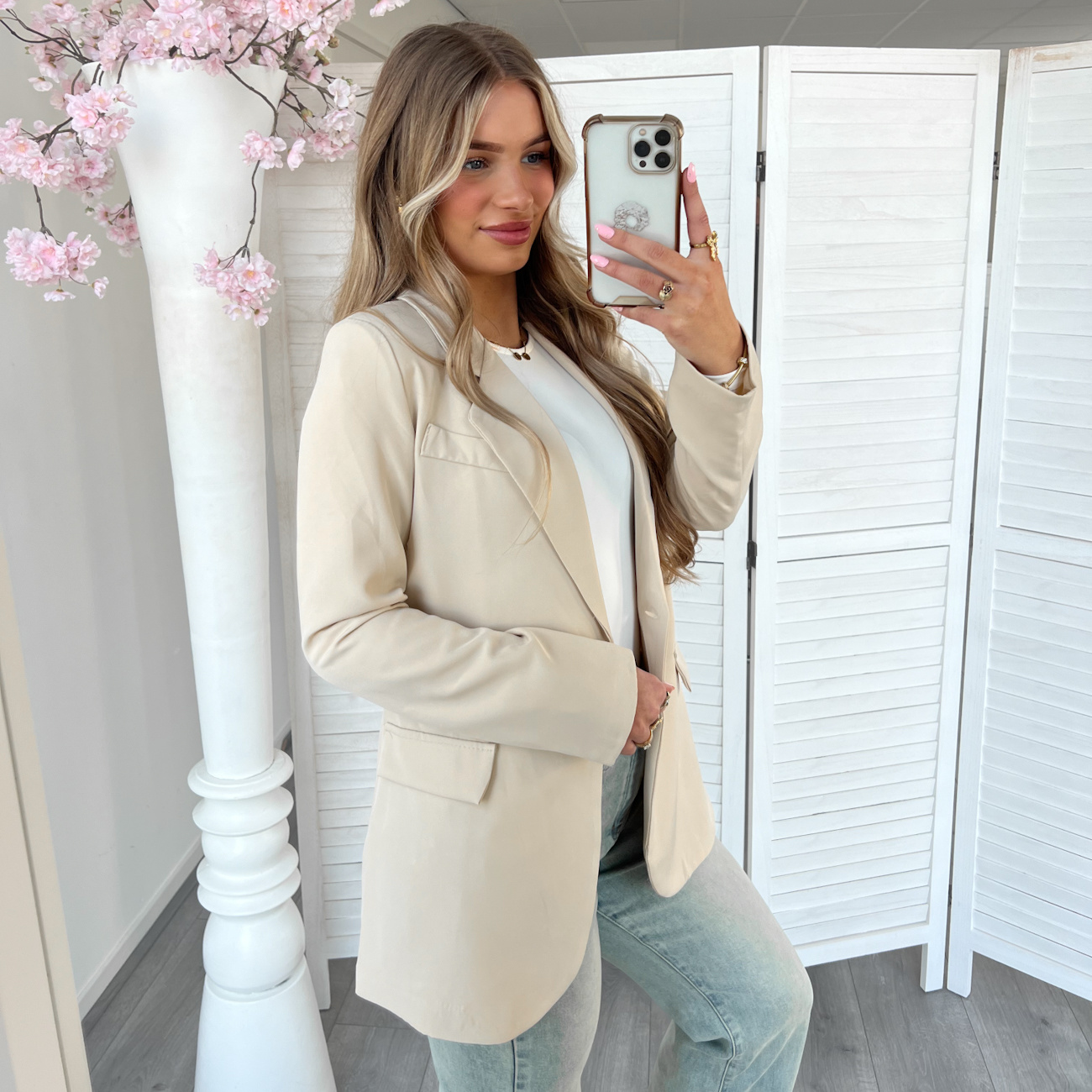 Super mooie beige blazer met schoudervulling en beige afwerkingen. Mooi open of juist dicht te dragen.