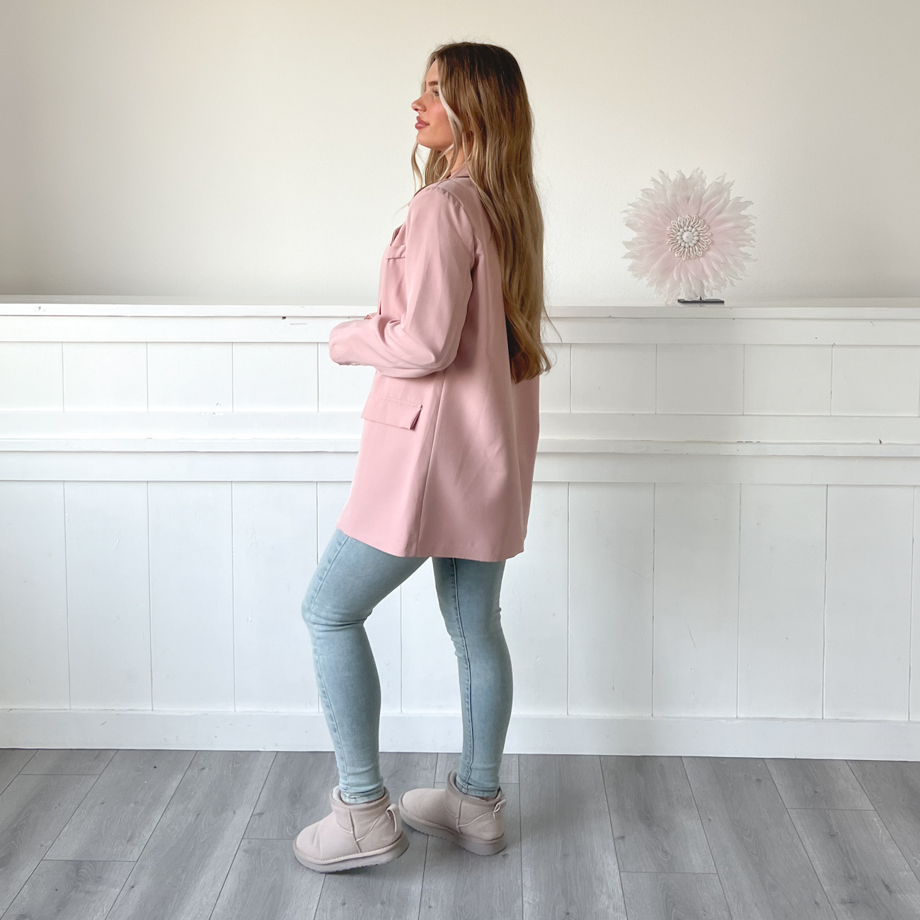 Super mooie roze blazer met schoudervulling en roze afwerkingen. Mooi open of juist dicht te dragen.