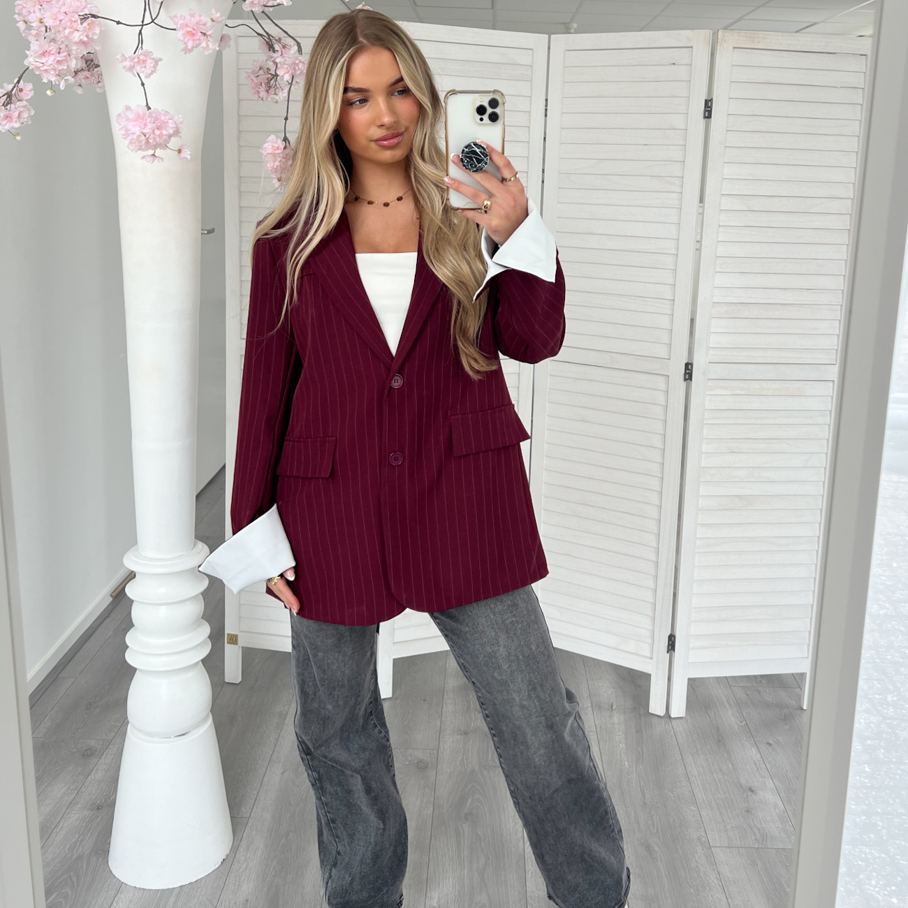 Leuke bordeaux blazer met dunne witte strepen en blouse mouwtje als je deze omslaat (zoals op de foto). De blazer heeft twee knopen, een nep borstzakje en subtiele schoudervulling.