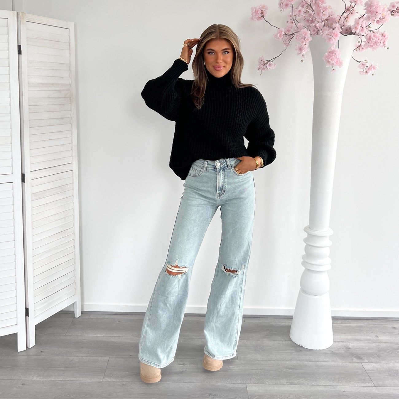 Mooie blauw met doffe gloed wide leg jeans, scheuren op de knieën en high waist fit.