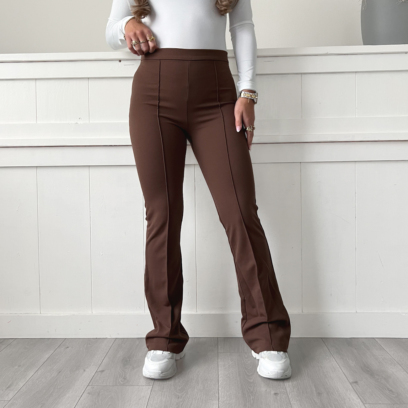 Super mooie bruine flared pantalon, chique maar toch comfy! Je trekt hem gemakkelijk aan met een verborgen rits aan de zijkant.