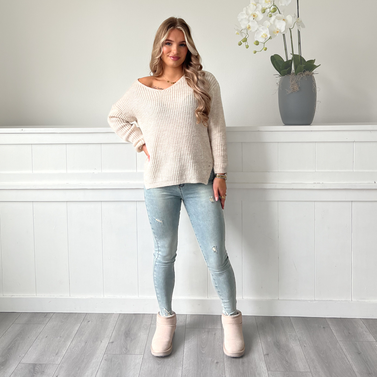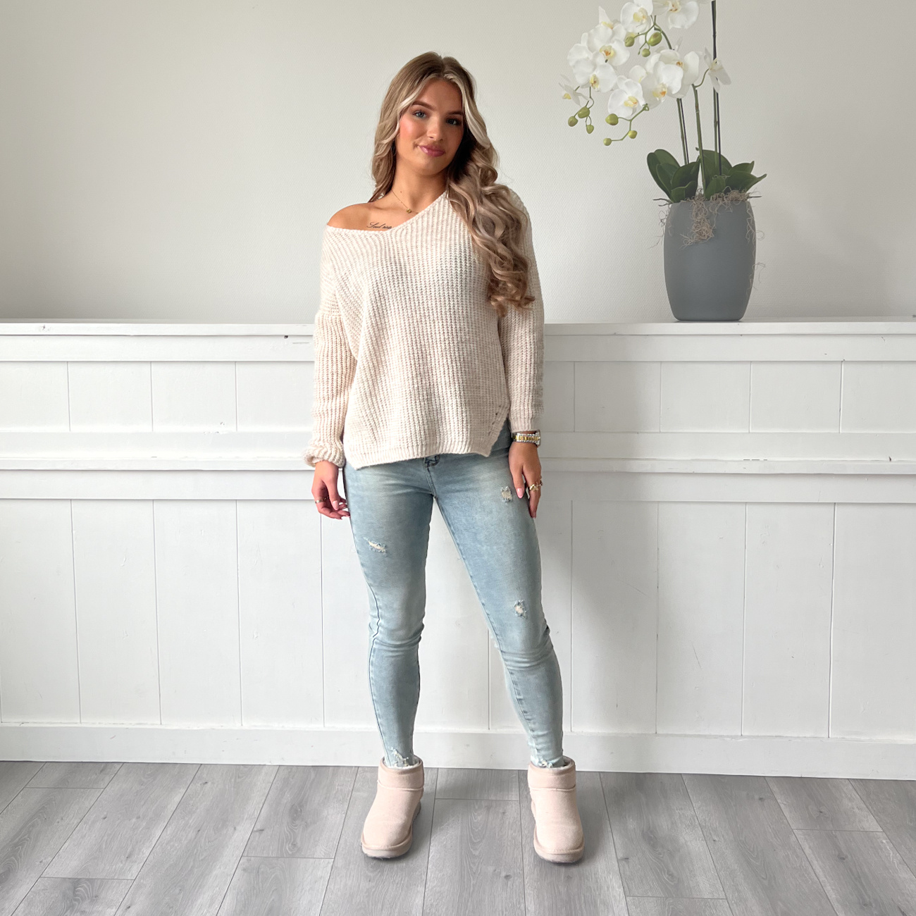 Mooie gebreide v hals trui, normaal te dragen of zoals op de foto met een zijde off shoulder.