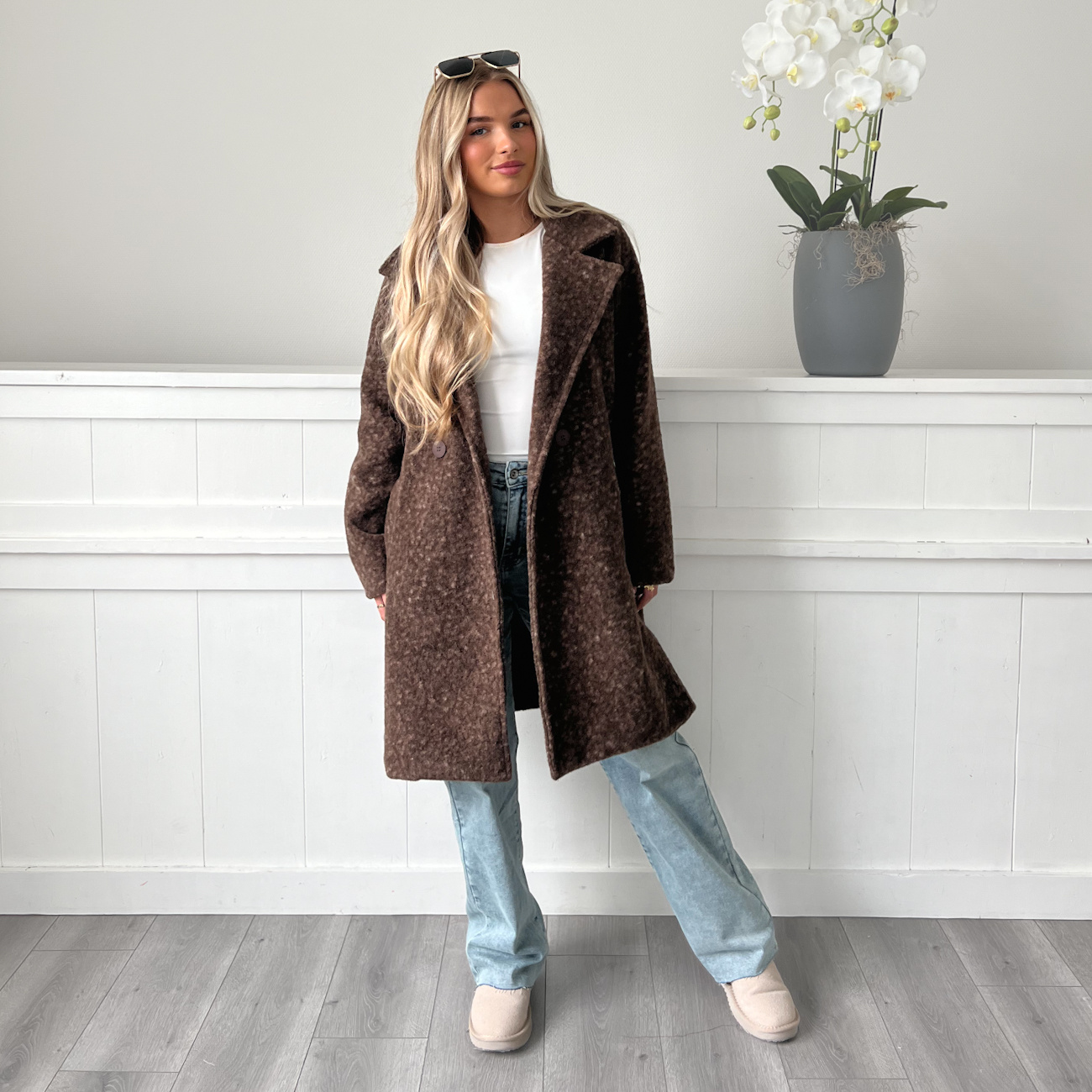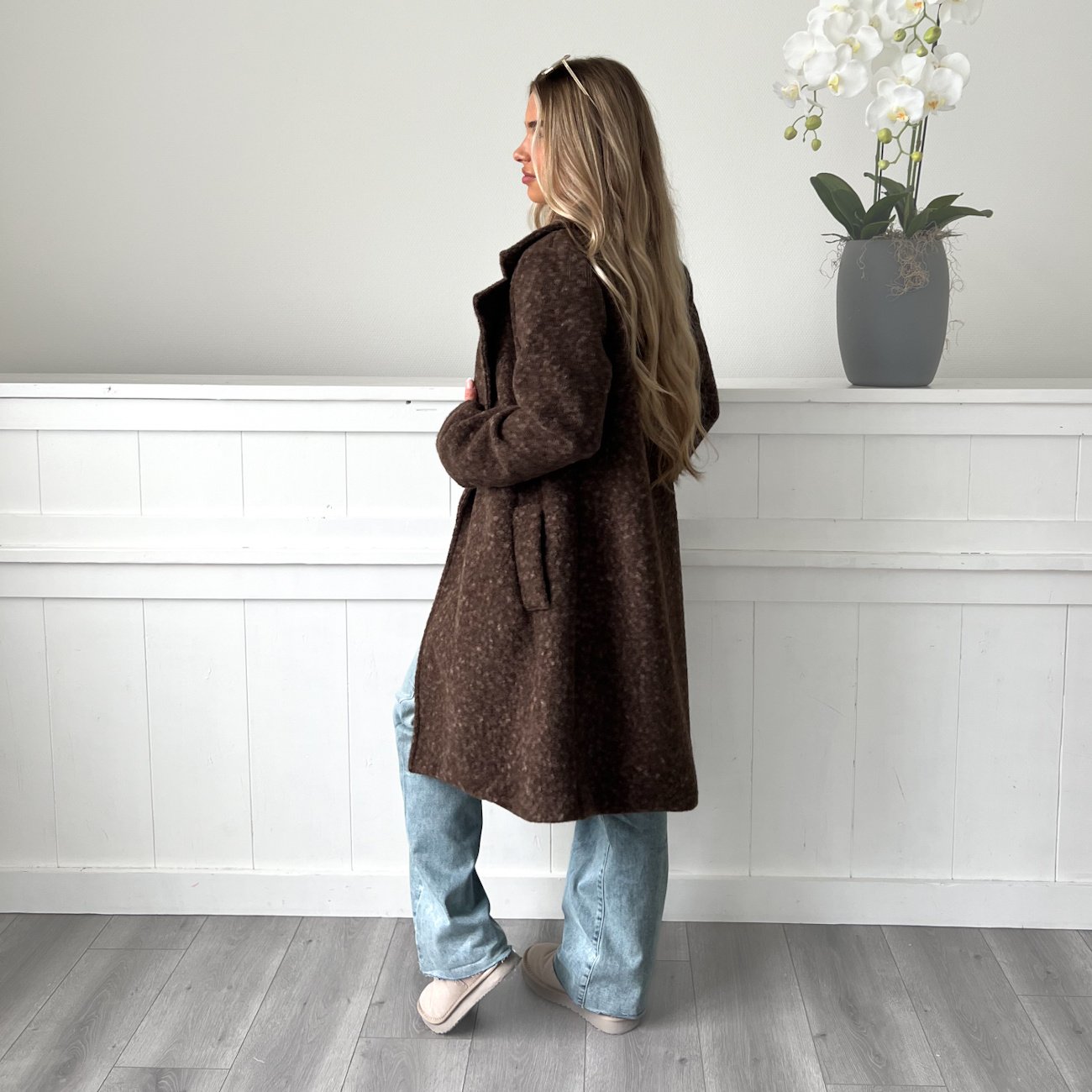 Super mooie stoffen mantel jas met lichte stipjes. De jas heeft twee steekzakken en een knoop waarmee je hem dicht kunt dragen.