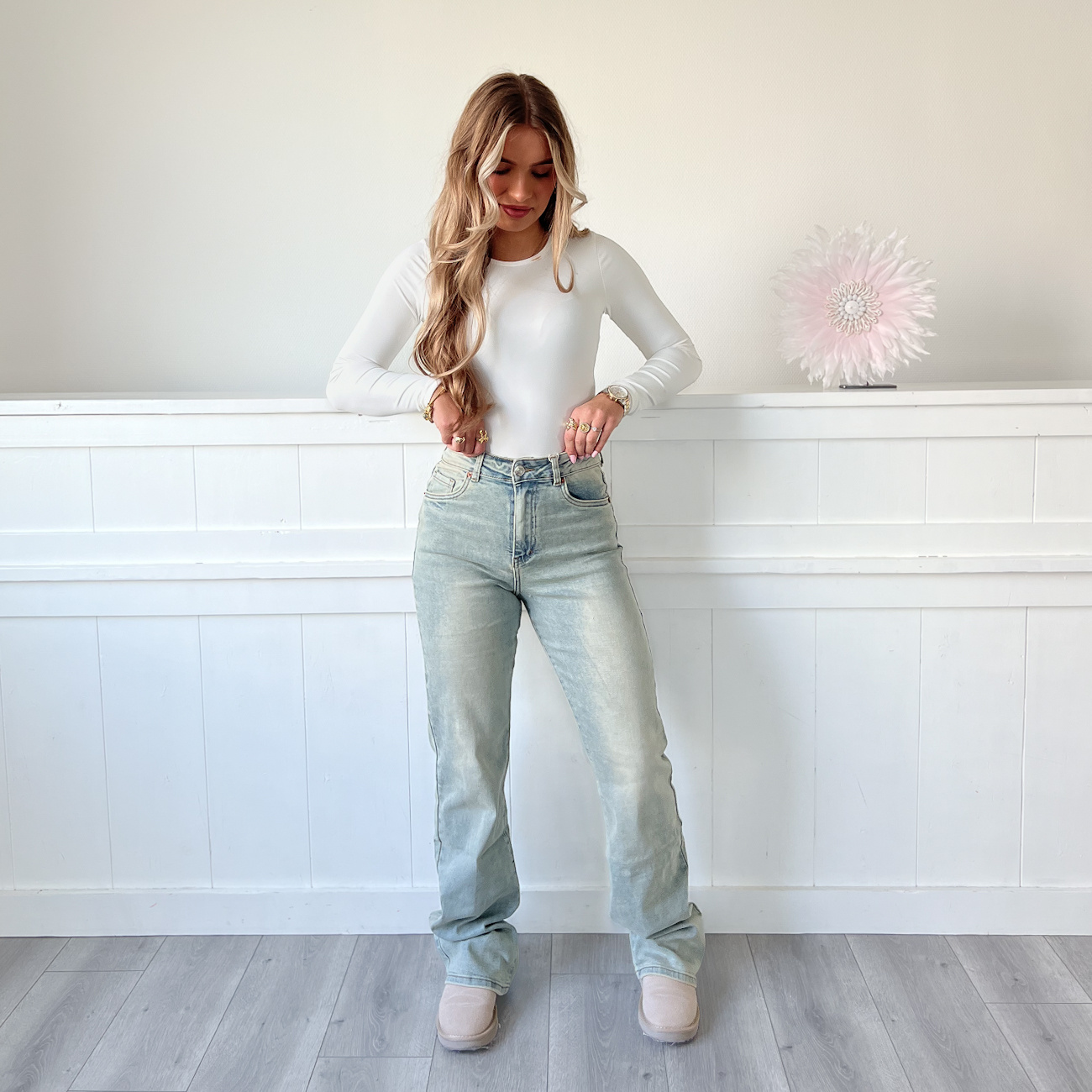 Super mooie blauwe tall wide leg jeans met dirty wassing. Extra lang! Van ons favoriete jeansmerk: VS MISS JEANS. Veel stretch en zit super comfy.