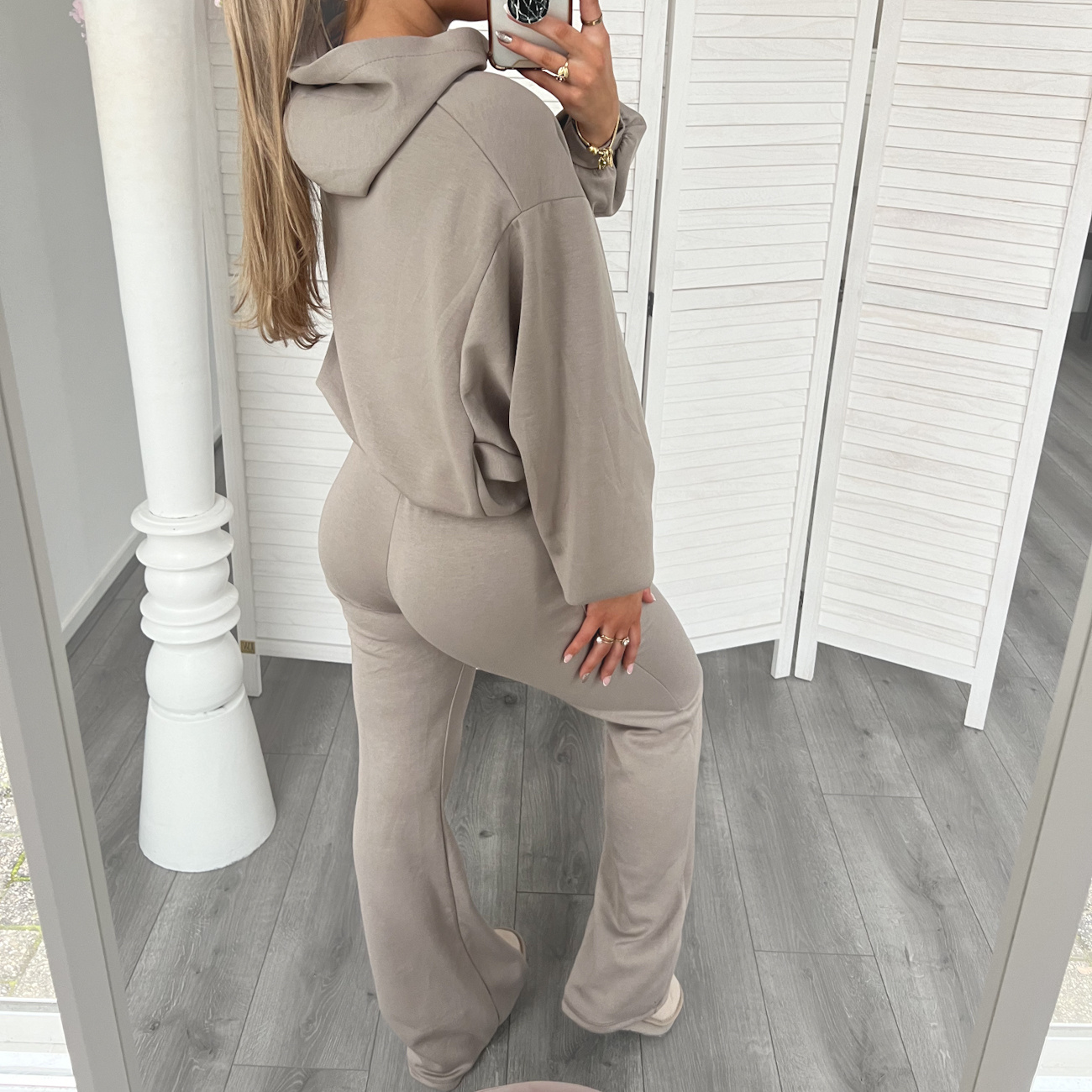 Super mooie flared set bestaande uit een cropped sweater met capuchon en een flared broek. De stof is echt fijn en lekker zacht, het pak zit comfy en ziet er toch classy uit!