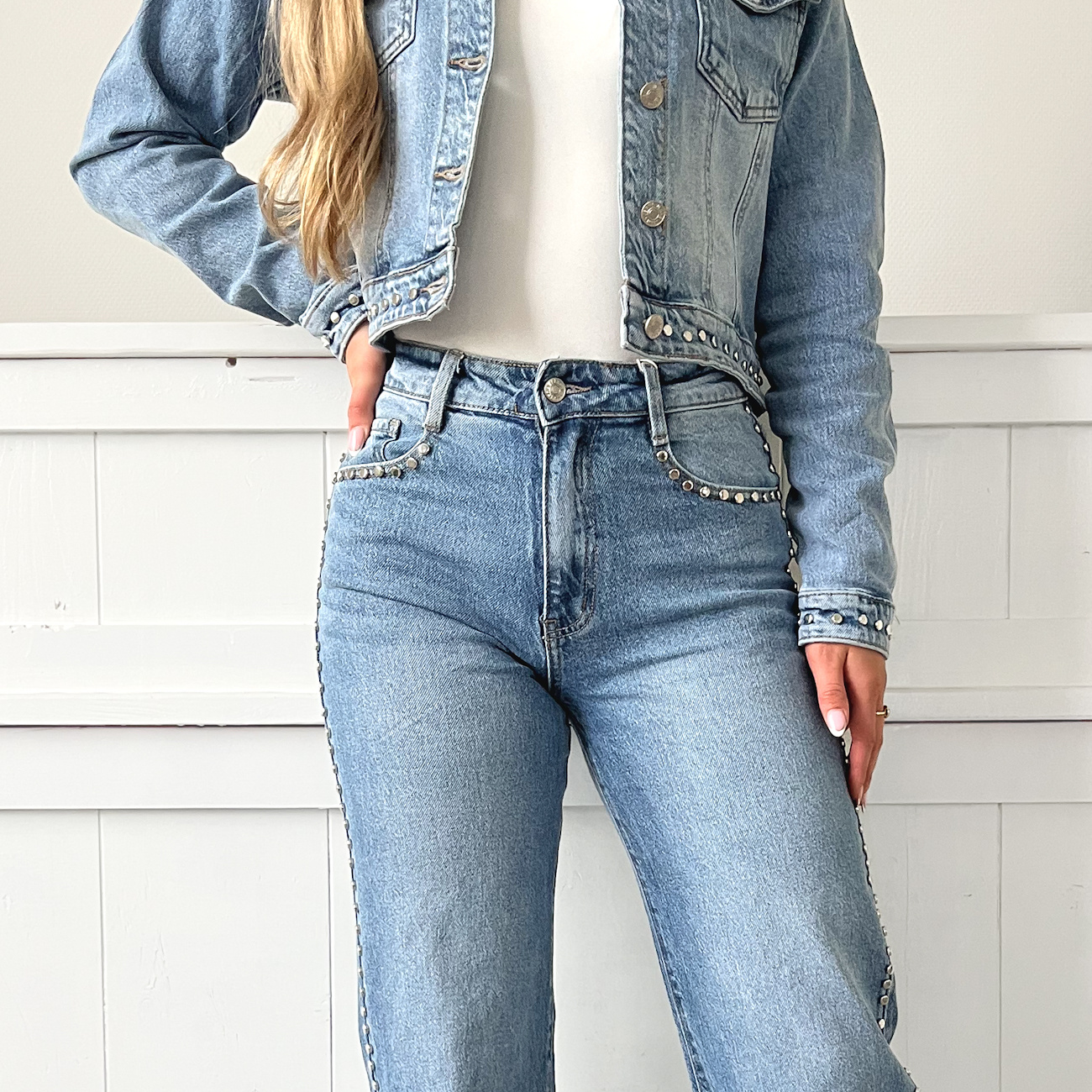 Hoe gaaf is deze blauwe jeans met studs details! Te dragen als set met het Kathy spijkerjasje of gewoon als statement jeans. De jeans heeft stretch en zit echt heel fijn, het is een wide leg en high waist fit.