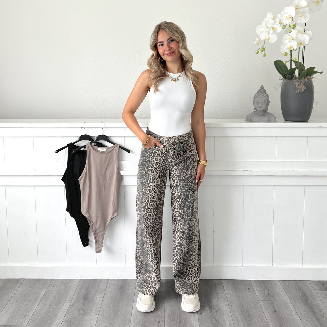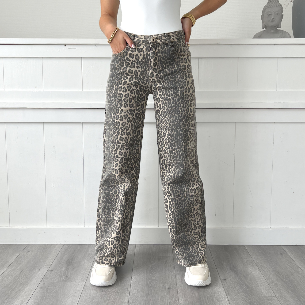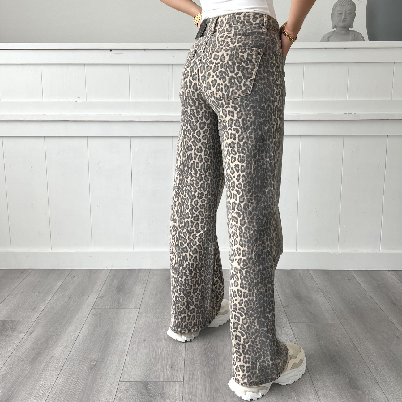 Super mooie beige bruine leopard jeans, wide leg/dad fit. Stretch en zit erg fijn!