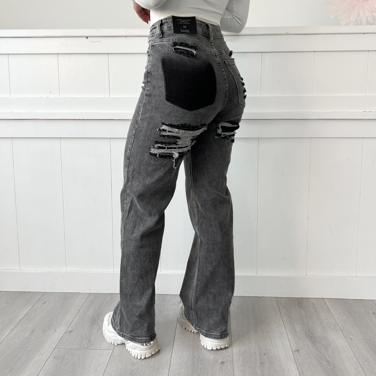 Super mooie grijze 'loose straight, stretch & full lenght' jeans. Love de details op de achterkant!