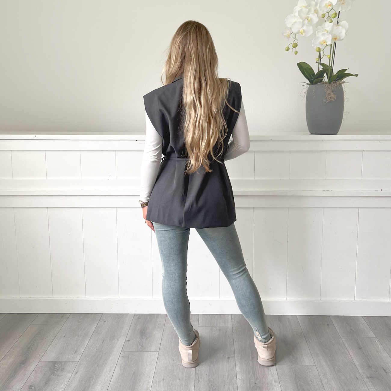 Super leuk mouwloos blazer gilet met ceintuur, knoop en schoudervulling.