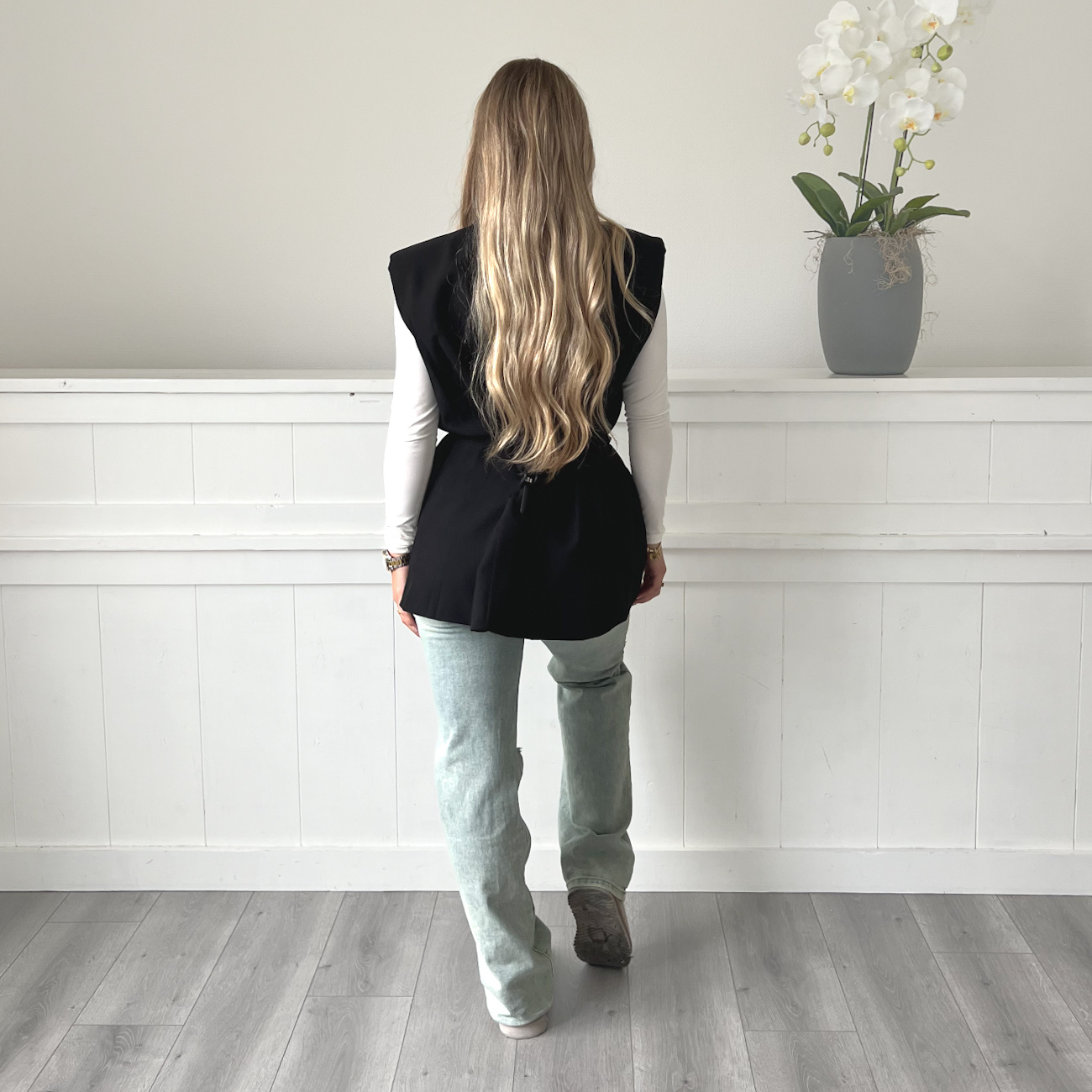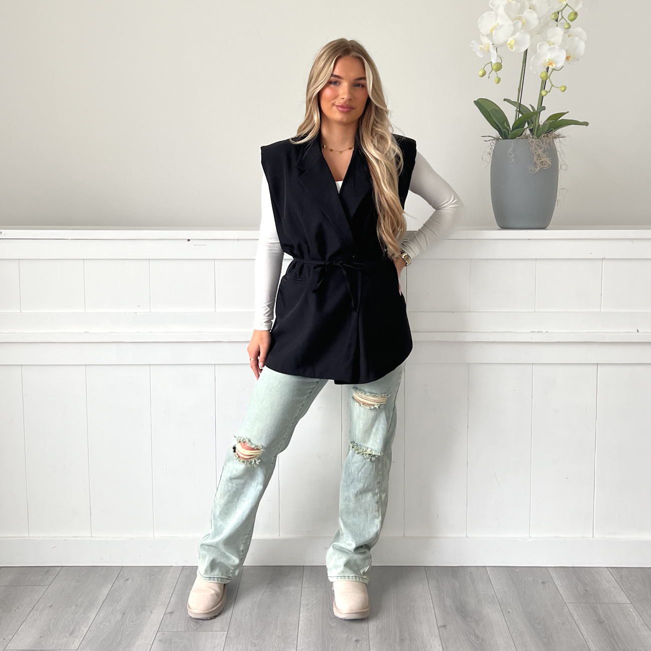 Super leuk mouwloos blazer gilet met ceintuur, knoop en schoudervulling.