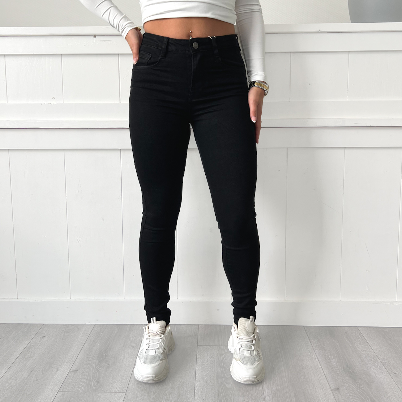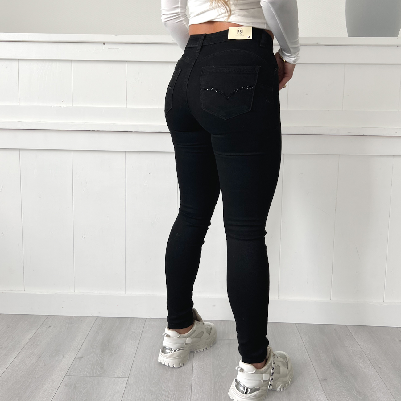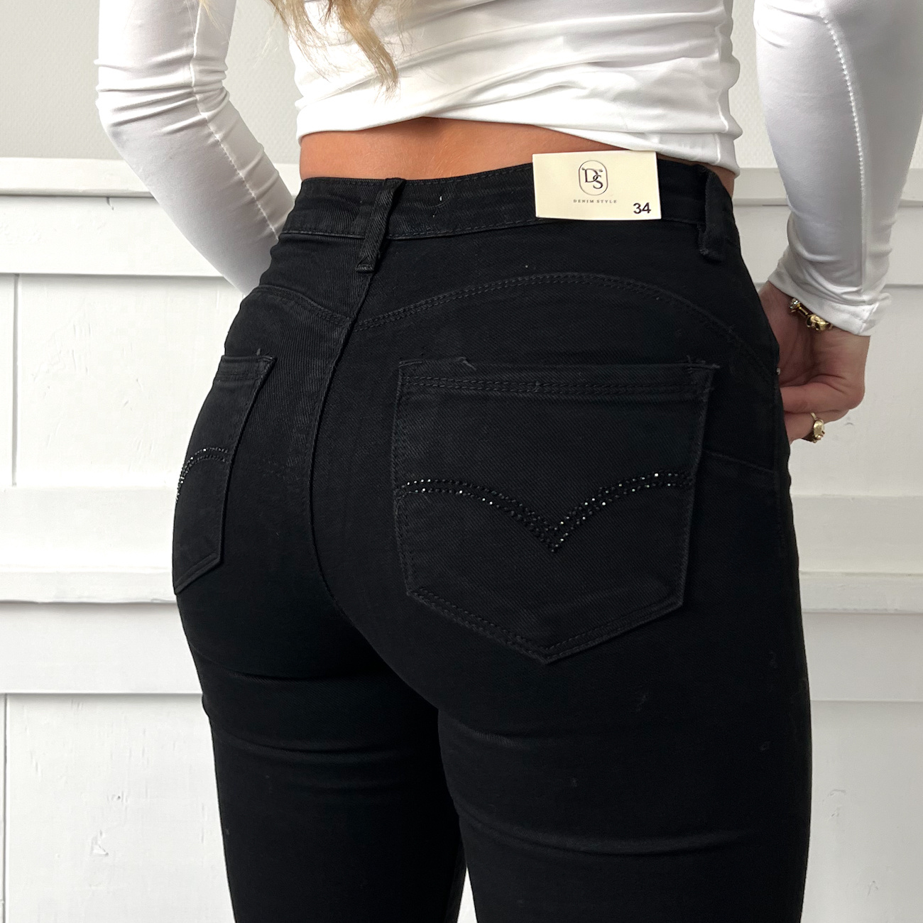 Mooie zwarte stretch jeans met zwarte diamantjes V boog op kontzakken.