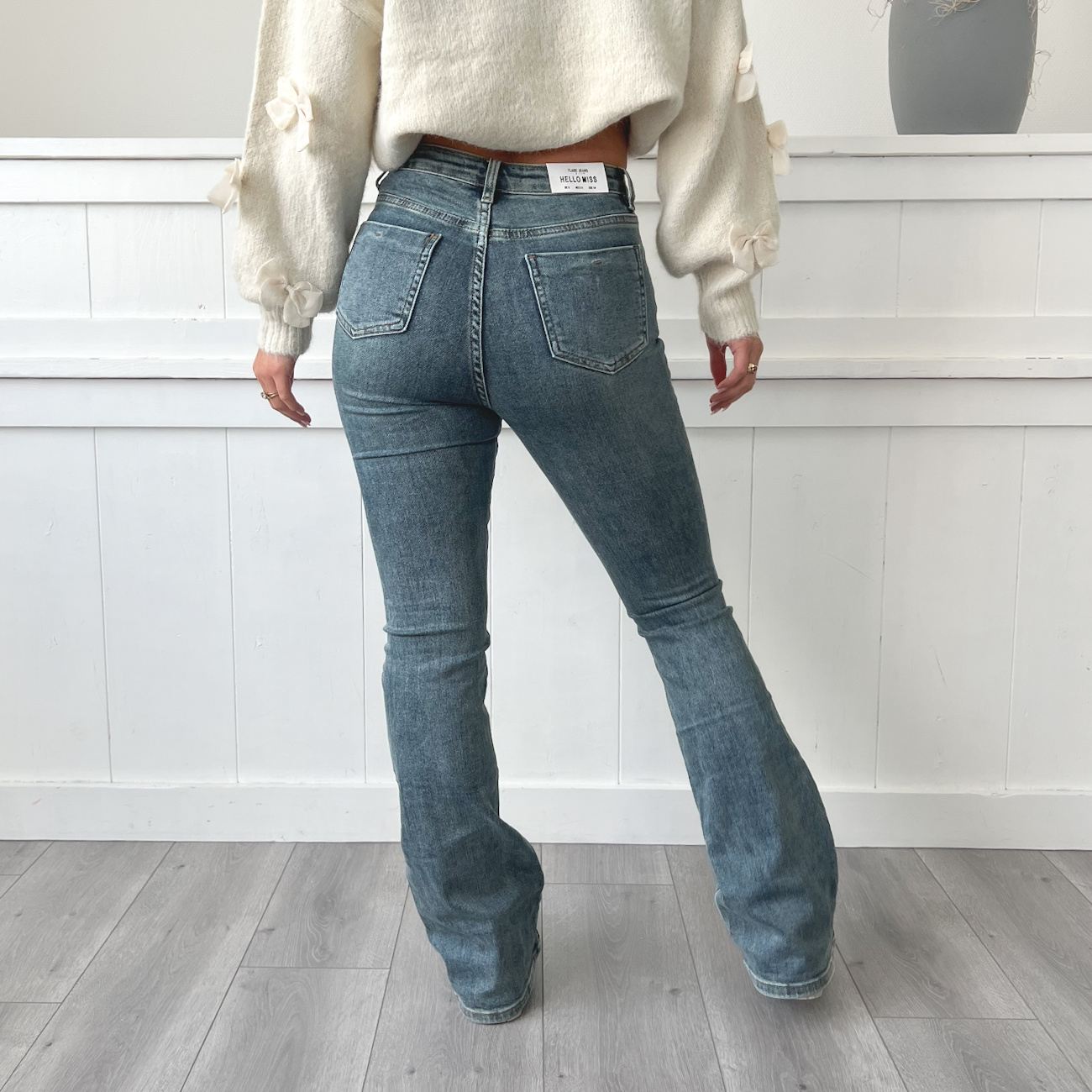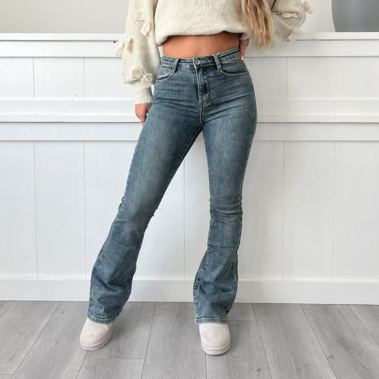 Super mooie blauwe flared jeans met een doffe gloed eroverheen. Veel stretch en extra lang. De jeans heeft een high waist fit en zorgt voor mooie billen.