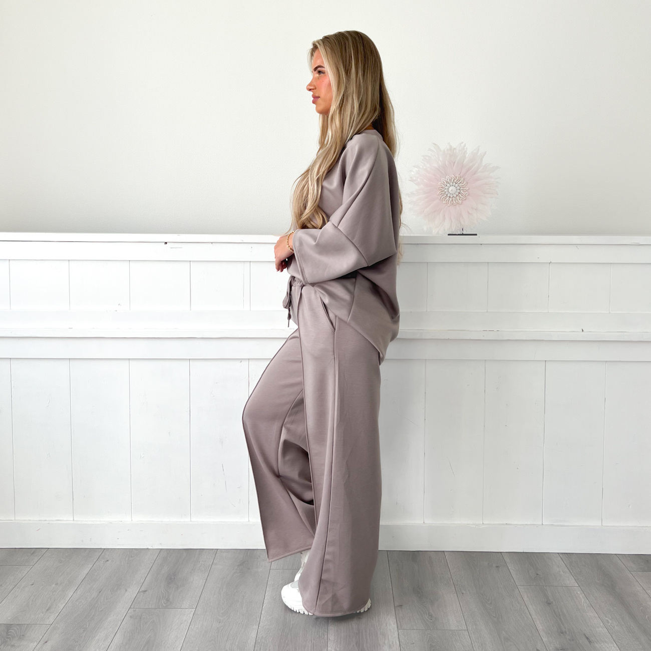 Super comfy setje van zacht stofje! Het setje bestaat uit een wide leg broek met zakken en elastieken koord en een oversized shirt die je los of in de broek kunt dragen.