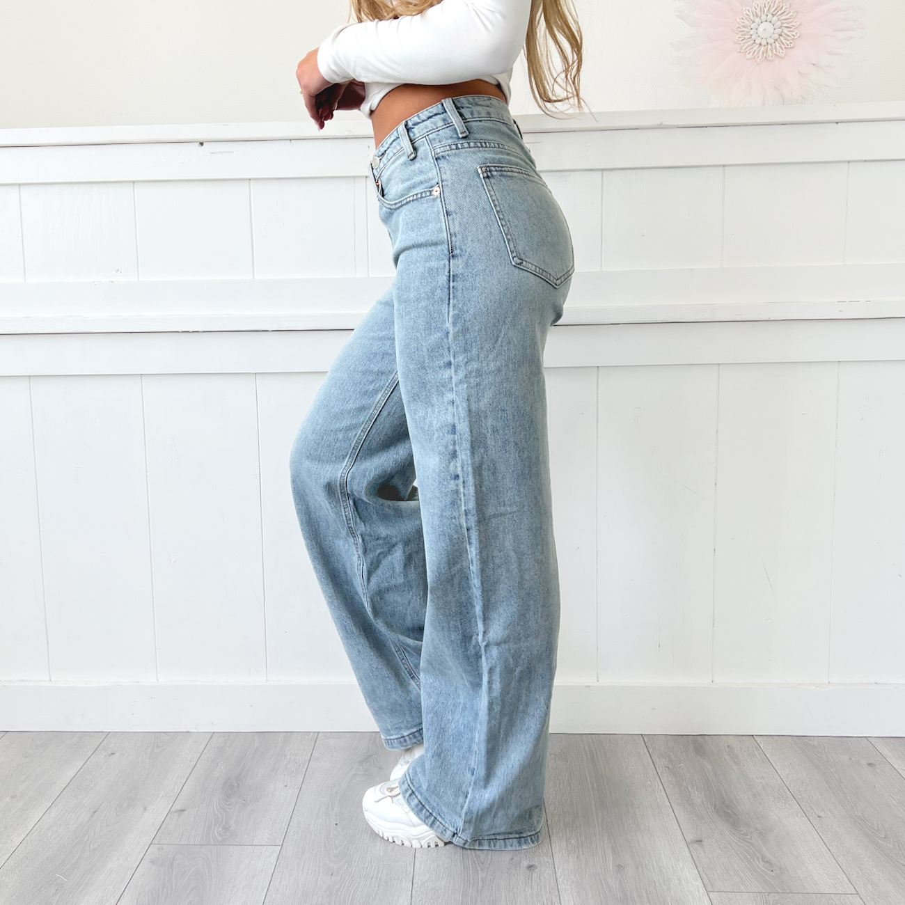 Super mooie wide leg jeans met schuine overslag en dubbele knoop. In een hele mooie blauwe dirty wash die te combineren is met vrijwel elke andere kleur.